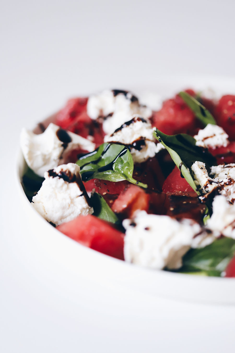 Laota taldrikule värske spinat, arbuusi ja Fetajuustu kuubikud.